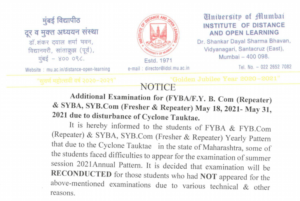 University Of Mumbai NOTICE Additional Examination for (FYBA/F.Y. B. Com (Repeater) & SYBA, SYB.Com (Fresher & Repeater) May 18, 2021- May 31, 2021 due to disturbance of Cyclone Tauktae. It is hereby informed to the students of FYBA & FYB.Com (Repeater) & SYBA, SYB.Com (Fresher & Repeater) Yearly Pattern that due to the Cyclone Tauktae … Read more